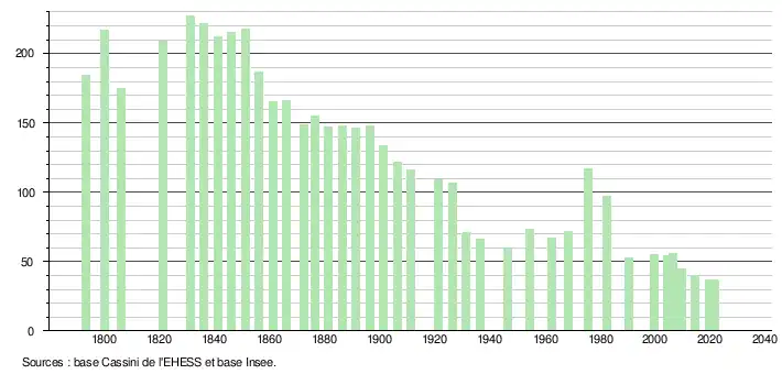 L'évolution du nombre d'habitants est connue à travers les recensements de la population effectués dans la commune depuis 1793. Pour les communes de moins de 10 000 habitants, une enquête de recensement portant sur toute la population est réalisée tous les cinq ans, les populations légales des années intermédiaires étant quant à elles estimées par interpolation ou extrapolation[16]. Pour la commune, le premier recensement exhaustif entrant dans le cadre du nouveau dispositif a été réalisé en 2004[17].