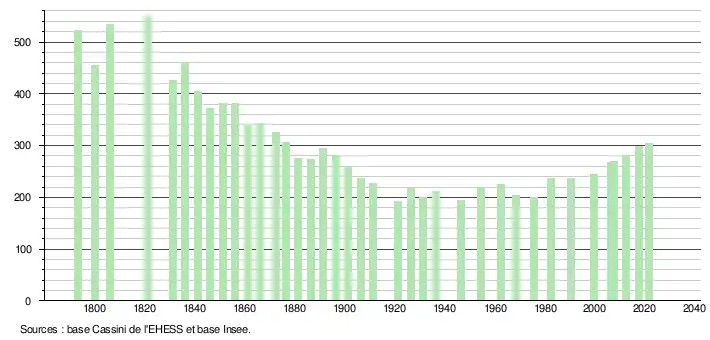 L'évolution du nombre d'habitants est connue à travers les recensements de la population effectués dans la commune depuis 1793. Pour les communes de moins de 10 000 habitants, une enquête de recensement portant sur toute la population est réalisée tous les cinq ans, les populations légales des années intermédiaires étant quant à elles estimées par interpolation ou extrapolation[24]. Pour la commune, le premier recensement exhaustif entrant dans le cadre du nouveau dispositif a été réalisé en 2007[25].