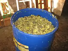 Les porcs ne peuvent pas, contrairement aux ruminants, digérer les tubercules crus, à cause de la présence de facteurs antinutritionnels[1] et de la mauvaise digestibilité de la fécule[2] ; c'est pourquoi les pommes de terre fourragères doivent être cuites avant leur distribution aux animaux. Les pommes de terre cuites peuvent être conservées dans des silos pendant plusieurs mois, ce qui permet d'étaler leur utilisation dans le temps et d'approvisionner régulièrement les élevages.