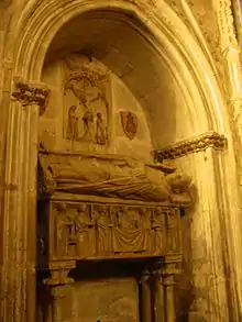 Tombeau de l'évêque François Climent Sapera (1410 - 1415 et 1419 - 1429), mort en 1430. Calvaire d'Antoni Canet, XIXe siècle, cathédrale de Barcelone.
