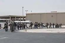 Le 24 août, Yevgheniy Yenin (en), le vice-ministre ukrainien des Affaires étrangères, a affirmé qu'un vol d'évacuation avait été détourné et envoyé en Iran ; cependant, les gouvernements iranien et ukrainien ont nié qu'un tel événement se soit produit[89]. La Corée du Sud a transporté par avion 380 Afghans qui avaient travaillé à l'ambassade de Corée ou dans des hôpitaux et des centres de formation professionnelle gérés par les forces d'ingénierie et de reconstruction coréennes[90]. Le DOD a rapporté que 21 600 personnes avaient été évacuées d'Afghanistan via l'aéroport international Hamid Karzai au cours des 24 heures précédentes[91]. Il s'agissait d'une augmentation significative de la vitesse des évacuations avant la date limite de retrait du 31 août[91]. Le nombre total de personnes évacuées d'Afghanistan via l'aéroport au cours des dix jours précédents était de 70 700[91]. Les efforts d'évacuation ont eu lieu en même temps qu'un retrait militaire américain progressif ; plusieurs centaines de militaires occupant des rôles de soutien jugés non essentiels se sont retirés les jours précédents, tandis que 5 800 soldats de l'armée américaine et des Marines américains sont restés pour garder l'aéroport [91]. Parmi les forces de protection américaines se trouvaient un élément du quartier général de la 82e division aéroportée, deux bataillons du Corps des Marines des États-Unis (2-1 et 1-8) et le 4e bataillon, 31e régiment d'infanterie, 10e division de montagne[92].