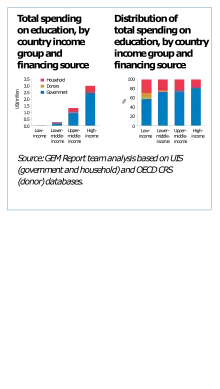 D’autres dimensions de l’apprentissage doivent être prises en considération aussi. Il s’agit notamment des retombées pour la société (par exemple le fait que soient encouragés les comportements propices à un développement social et environnemental durable, la citoyenneté mondiale, le vivre-ensemble et le respect de la diversité) ainsi que l’environnement offert par les écoles et les salles de classe. Ce dernier paramètre comprend le processus d’enseignement-et d’apprentissage, la présence d’enseignants convenablement formés et motivés, ainsi que la rigueur du processus pédagogique, la capacité de l’école d’exercer un vigoureux leadership, la participation de la communauté et le caractère démocratique de la gouvernance, ainsi que des structures et intrants matériels adéquats[13].