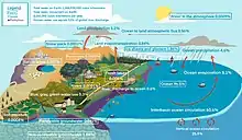 L'évaporation à l'échelle terrestre est globalement cinq fois plus importante au-dessus des océans qu'au-dessus des continents (85 % de l'évaporation est océanique), les précipitations y sont trois fois plus importantes[21] où l'énergie du rayonnement solaire transforme l'eau liquide en vapeur. L'océan évapore plus d'eau qu'il n'en reçoit sous forme de précipitations. Ce déficit d'environ 10 % se retrouve sur les continents, via la circulation de masses d'air transportant l'humidité atmosphérique (à l'état de vapeur d'eau dans l'air, de liquide ou de glace dans les nuages), sous forme d'un excès de précipitations par rapport à l'évaporation[20]. La transpiration est de loin le plus grand flux d'eau issu de la biosphère terrestre (64 % de l'évapotranspiration terrestre, donnée moyenne avec une grande marge d'incertitude) devant l'interception des précipitations (27 %), l'évaporation des sols (6 %) et l'évaporation des étendues d'eau à l'intérieur des terres (3 % issus principalement des cours d'eau et des lacs)[22],[23], ces données moyennes variant selon les climats[24].