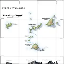 Le groupe des îles Alderman se compose de quatre îles principales : Hongiora, Middle, Ruamahuanui et Ruamahuaiti, qui sont les restes d'un cône volcanique.