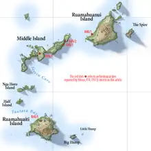 Lors de l'exploration initiale des îles Aldermen, des observateurs précoces tels que Sladden et Falla[3],[4] et Cochrane[5] n'ont pas réussi à identifier de signes visibles d'une occupation maorie antérieure. Cependant, les recherches menées par Bell et al. au cours des années 1951-58 ont révélé des indications intrigantes sur Ruamahuanui et Middle Island. Le rapport historique du capitaine Cook de 1769[6] attestait de l'occupation des îles, et les observations de Wade en 1842[7], lors d'un séjour temporaire sur Ruamahuaiti, mentionnaient des vestiges de huttes et une abondance de choux sauvages près de la baie de Tuatara.