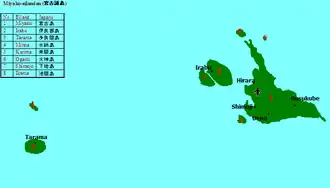 - et plus à l'ouest Tarama-jima (多良間島, 19,75 km2) et Minna-jima (水納島, 2,15 km2)[1].