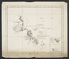 Carte de James Cook de 1784 sur laquelle figurent, sous leur nom, les îles de la Fortune (à droite au centre) avec la mention Terre vue pour la 1re fois.
