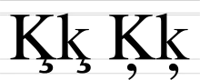 K cédille majuscule et minuscule : à gauche, la forme avec la cédille classique ; et à droite la forme avec une cédille comme une virgule souscrite utilisée en letton.