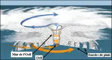 L'œil est constitué par de l'air subsident (mouvement descendant)[1],[3],[4],[5],[Note 1] entouré d'un mur de nuages orageux (cumulonimbus) dans lequel les mouvements ascendants sont rapides. Les températures chaudes de l'œil s'expliquent par la compression adiabatique de l'air subsident. La plupart des sondages effectués dans l'œil montrent que les basses couches restent relativement humides avec une inversion de température au-dessus, ce qui tendrait à démontrer que les couches supérieures d'air subsident de l'œil n'atteignent pas le sol mais restent cantonnées à une altitude de 1 à 3 km de la surface[1].