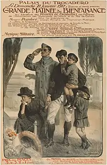 Une loi du attribue aux femmes de mobilisés, épouses et compagnes non mariée, une allocation de 1,25 F augmentée de 50 centimes par enfant en dessous de 16 ans, portée le à 1,50 F et la majoration pour enfant à charge à 1 F et le à 1,75 F, la majoration à 1,25 F pour les deux premiers enfants, 1,50 F pour les suivants. À partir d', cette allocation est versée aux femmes de prisonniers nécessiteuses. Ces allocations seront supprimées par une loi du . En , une allocation d'un montant analogue est versée aux réfugiés sous conditions de ressources. La demande est faite au maire de la commune hébergeant les réfugiés, qui la transmet - « revêtue de son avis » - à la commission cantonale compétente. Un arriéré de 4 mois peut être versé à la famille, le montant restant dû (précisé par certificat délivré par la préfecture) à la famille devant être payé soit à la libération du territoire, soit à la fin des hostilités[1],[3]. Les allocations aux réfugiés furent supprimées en 1921.