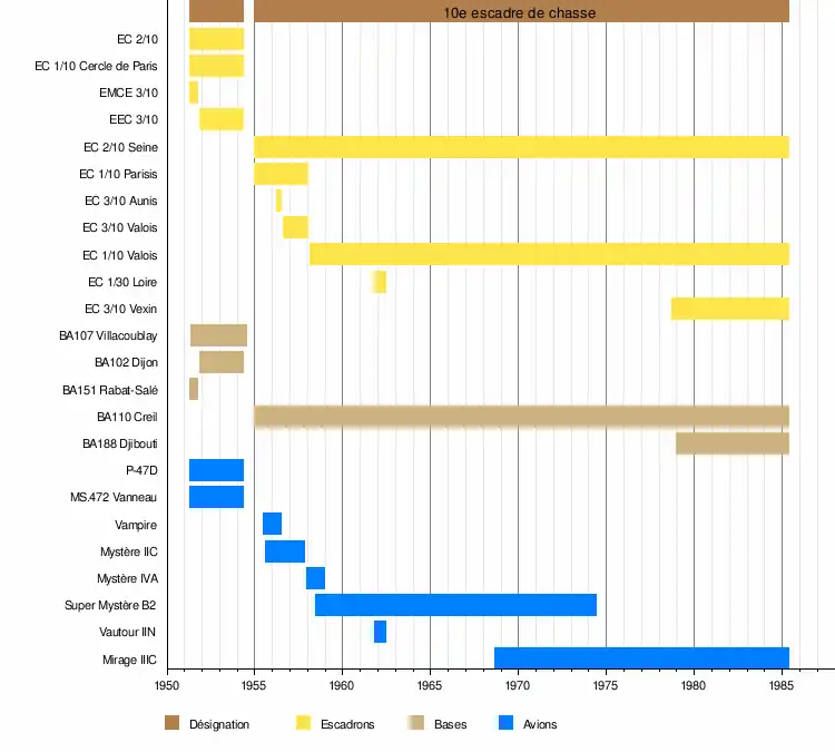 La 10e Escadre de chasse tactique est créée le à partir des Centres d'Entraînement des Réservistes des bases de Villacoublay et de Rabat Salé. Elle est alors composée de trois escadrons. L'EC 1/10 avec 16 chasseurs F-47 Thunderbolt et l'EC 2/10 équipé de 8 MS-472 et 4 F-47 sont basés à Villacoublay. L'EC 3/10 et ses 8 MS-472 et 8 F-47 est quant à lui basé à Rabat-Salé, mais il quittera la 10e EC le .