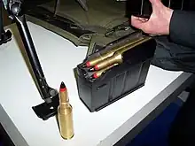Le combustible est constitué de 28,8 g de poudre sans fumée. On connaît deux versions différentes de balles. La première a une chemise conventionnelle avec une longue extrémité, elle causait une usure importante du canon. Un autre type avec une extrémité plus ronde a été utilisé depuis 1957.