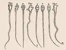 Sperme de lapins (Figs 1-4) et de chiens (Figs. 5-8), dessiné par van Leeuwenhoek en 1678 ou 1677.