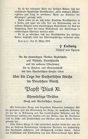 - 14 mars : encyclique Mit brennender Sorge de Pie XI « sur la situation de l’Église catholique dans l’Empire allemand », condamnant le nazisme[60]. C’est le premier document pontifical évitant le latin et adoptant, vu la gravité du sujet, une langue moderne.