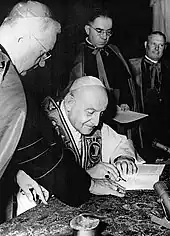 Le pape Jean XXIII signant l'encyclique Pacem in Terris le  au Vatican.