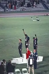 - 16 octobre : Tommie Smith remporte le 200 mètres des Jeux olympiques avec un chrono de 19 s 83. Cet évènement est resté dans l’Histoire car il monte sur le podium, avec John Carlos (le troisième de la course), en chaussettes noires montantes et levant un poing ganté de noir, tête baissée pendant l’hymne américain. Ce geste est souvent associé aux Black Panthers, bien que Tommie Smith n’en ait jamais fait partie. Il est par la suite menacé de mort par des spectateurs et exclu à vie des Jeux Olympiques[46].
