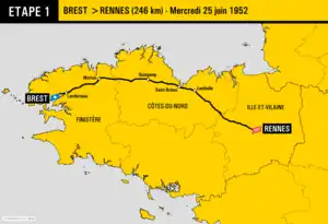 La 1re étape du Tour de France 1952 s'est déroulée le entre les villes de Brest, qui accueille pour la première fois le départ d'un Tour, et de Rennes, qui est une ville-étape du Tour pour la sixième fois de son histoire. Le parcours franchit les reliefs bretons à travers les départements du Finistère, des Côtes-du-Nord et de l'Ille-et-Vilaine, sur une route accidentée longue de 246 km. Il passe notamment les villes de Morlaix, Guingamp et Saint-Brieuc.