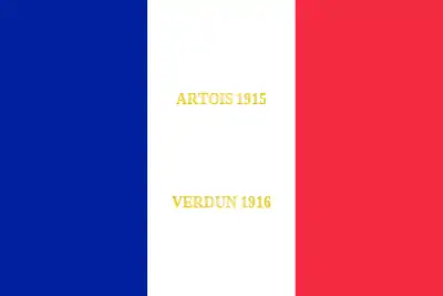 Il porte, brodées en lettres d'or dans ses plis, les inscriptions Artois 1915 et Verdun 1916[2].