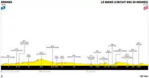 La première partie commence à la sortie de Rennes, à l'entrée de la route nationale jusqu'à Laval et présente quelques petites côtes (650 mètres de dénivelé sur 70 km). La deuxième partie entre Laval et La Flèche est une longue ligne droite de 70 km, quasiment plate à l'exception d'une côte au km 130 à l'approche de la Flèche (450 mètres de dénivelé sur 70 km). La dernière partie est également une longue ligne droite (avec quelques petits reliefs au km 150) jusqu'au début de l'agglomération du Mans, à Arnage, où le peloton prend la route du circuit (270 mètres de dénivelé sur 40 km)[2]. De l'entrée du circuit aux tribunes de la ligne d'arrivée, sur 2,5 km, la route du circuit est coupée en deux sur le milieu pour permettre aux coureurs de l'emprunter deux fois, une première fois après être rentré sur le circuit et une deuxième fois après avoir parcouru une moitié de tour du circuit, débouchant sur l'arrivée de l'étape[3].