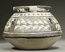 - Vers 3500-3000 av. J.-C. : culture néolithique de Yangshao récent en Chine. Des systèmes régionaux complexes entre villages se développent et les premières différenciations sociales apparaissent. Deux types de cultures émergent : les cultures du type de Dadiwan et celles du type de Xishan[34]. Le site de Dadiwan livre trois sortes d’habitations dont un grand bâtiment communautaire de 290 m², qui devait servir de lieu d’échanges et de festivités entre les villages de la région alentour. Des vases de stockage, des bols et des récipients en céramique standardisés de tailles diverses utilisés peut être comme mesures à grain y ont été retrouvés[27]. Autour de 3000 av. J.-C., ces différentes cultures s'effondrent assez rapidement, face à un environnement climatique plus froid et sec, une surexploitation des terres et la déforestation. La population décroît[35].