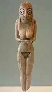 - Vers 3300-2800 av. J.-C. : apparition de l’État et de l’écriture en Iran du sud-ouest, dit civilisation proto-élamite (Suse III)[49]. La Susiane paraît opérer un retournement vers l’Iran aux environs de 3100 av. J.-C. La plaine ou bas pays, avec Suse, est alors étroitement associée à la montagne (Anshan). L’art exprime clairement l’appartenance de Suse au domaine iranien : les sceaux, moins diversifiés qu’à l’époque d’Uruk, mettent en scène des animaux en mouvement ou pratiquant des activités humaines ; des statues apparaissent qui ne peuvent être confondues avec celles de Sumer. Des tablettes à l’écriture non sumérienne, très nombreuses et parfois de grand format, sont l’indice d’une gestion économique très poussée. Suse apparaît comme un centre d’échanges actifs en relations étroites avec Sialk au nord-est, Tepe Yahya au sud-est et Shahr-e Sokhteh au-delà du désert de Lut.