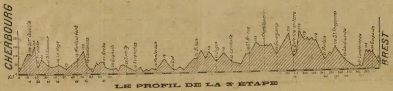Vingt-sept coureurs, sur les soixante-sept engagés au départ du Tour, prennent le départ de la troisième étape à Cherbourg. Le parcours, vallonné et long de 405 km traverse ensuite les villes de Coutances, Avranches, Dinan, Lamballe, Saint-Brieuc, Guingamp, Belle-Isle-en-Terre, Morlaix et Landerneau avant l'arrivée à Brest[1].