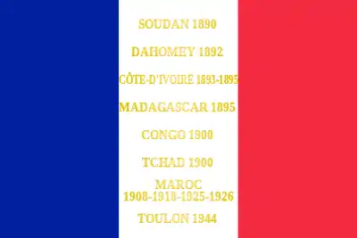 Soudan 1890 Dahomey 1892 Côte-d'Ivoire 1893-1895 Madagascar 1895 Congo 1900 Tchad 1900 Maroc 1908-1918-1925-1926 Toulon 1944 |