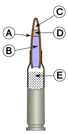 La balle est profilée pour une meilleure pénétration dans l'air. Son projectile blindé pointu recouvre un noyau plat en acier précédé d'un insert en plomb ce qui laisse un espace vide à l'avant de la munition. Cette configuration permet au nez de s'écraser lors de l'impact. Ce facteur favorise le basculement sur son axe, ce qui la fait alors tournoyer sur elle-même en pénétrant sa cible. En effet, le centre de gravité de la balle est très reculé. À l'époque de la conception de M74, il était considéré que ce basculement était la principale origine de la capacité de destruction d'une cartouche militaire. Il s'est avéré depuis, selon les recherches de Martin Fackler, que dans le cas de la 5,56 OTAN, la fragmentation de la balle occasionnait l'essentiel des dommages.[réf. nécessaire]