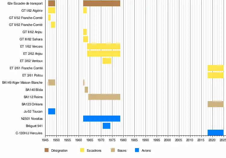 La 62e escadre de transport est créée au lendemain de la Seconde Guerre mondiale en Algérie. Elle regroupe deux groupes de transport (GT) :
