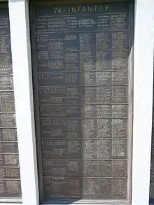 Le 74e d'infanterie reçu son drapeau le 5 mars 1862, alors qu'il bivouaquait aux environs de Whasington, DC. Le représentant Robert McKnight présidait alors la cérémonie. Le régiment participa à la "marche de la boue" à Virginia's Shenandoah Valley au printemps de 1862, dans l'opération dirigée contre le général Stonewall Jackson.