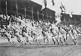 L'épreuve du 800 mètres féminin fait sa première apparition olympique lors des Jeux de 1928 à Amsterdam. L'Allemande Lina Radke remporte le titre et améliore de près de trois secondes son propre record du monde en 2 min 16 s 8, devançant la Japonaise Kinue Hitomi et la Suédoise Inga Gentzel[42]. Mais, jugée trop difficile pour les femmes après que certaines concurrentes se soient allongées sur la piste après la course afin de récupérer, l'épreuve est retirée du programme olympique, les membres du Comité international olympique estimant que les femmes étaient trop fragiles pour courir une distance aussi longue[43]. Ainsi, aucune course féminine supérieure à 200 m ne sera disputée dans le cadre des Jeux olympiques avant 1960.