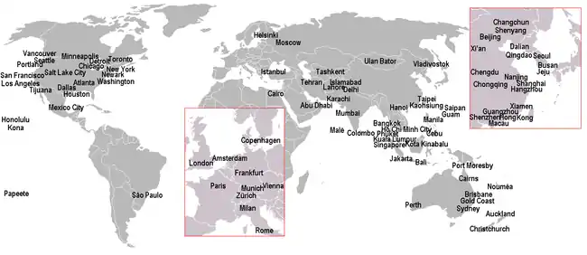 Villes internationales desservies depuis l'aéroport international de Narita en 2009.