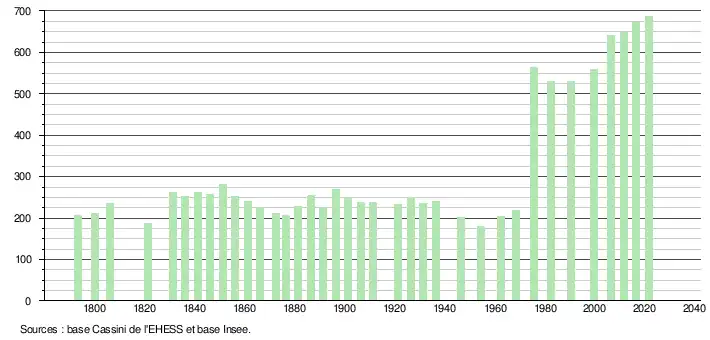 - Population municipale légale en vigueur au 1er janvier 2024, millésimée 2021, définie dans les limites territoriales en vigueur au 1er janvier 2023, date de référence statistique : 1er janvier 2021.