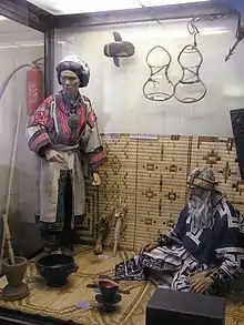 4. Chapter V – Furniture There is not much furniture in an Ainu hut. The center of the building is taken up with the hearth, which is a long open space surrounded with pieces of wood. In this space, as many as three or four fires can be kept burning at one time if necessary. Above the firplace is suspended from the roof an apparatus or frame containing pot-hooks and all kinds of cooking paraphernalia. This instrument is called tuna. Above this necessary piece of furniture, fish, bear's flesh, and venison are hung to dry ; and as the tuna is a kind of framework with a few bars as a bottom, wheat, barley, or millet are placed in mats and put upon it, that they may be cured ready for threshing and pounding into flour. That part of the hut extending from the head of the fireplace to the east window is, as already stated, held sacred, and is set apart for special strangers and visitors, particularly honoured guests. The right-hand corner is the place where all the Ainu treasures are kept, also a great number of family inao and nusa ; and upon the beams over these, heirlooms, old swords, bows and arrows, and fishing implements are stowed away. In long boxes next to these are preserved the special ornemental clothes and important things belonging to the master of the hut. Next to the sacred east corner comes the bedstead of the heads of the family. This consists merely of a raised platform or bench, having a screen of mats hung around it. After the bed comes the private corner of the mistress, where she keeps a little box in which are stored her beads, fings, necklaces, and other little nicknacks. Next to this is the sleeping place for the daughters of the family ; then the doorway leading to the ante-chamber. On the other side of the doorway the water-butt, tube, pots and pans are generally found. After this the sleeping shelves of the male member find a place. Then comes the south door, when a hut can boast of two doors. Friends sleep at the east end, near the window. The master and mistress and younger members of the family look upon the right-hand side of the hearth as their special place, and the rest of the family occupy the opposite side. Honoured guests take the head of the fireplace, and common visitors remain at the west end of the hearth near the doorway. Sometimes the Ainu, especially whan they expect visitors, place mats made of a hard kind of reed upon the floor ; and upon these they spread yet another softer mat, made of rushes and grass. These are used instead of stools and chairs to sit upon. Hence, to spread a mat for a person is equal to offering him a chair. (…) Ainu, when they die, are rolled up in mats and buried ; they are not placed in coffins.