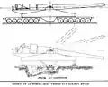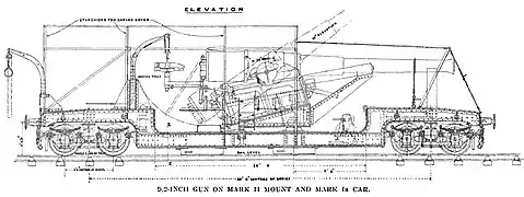 - Affût truck à glissement : le canon est solidaire du châssis et le recul est atténué par le frottement de pièces de bois contre les rails de la voie de chemin de fer. La direction de tir est réglée par le positionnement sur un épi courbe de voie ferrée, construit pour l'occasion.
