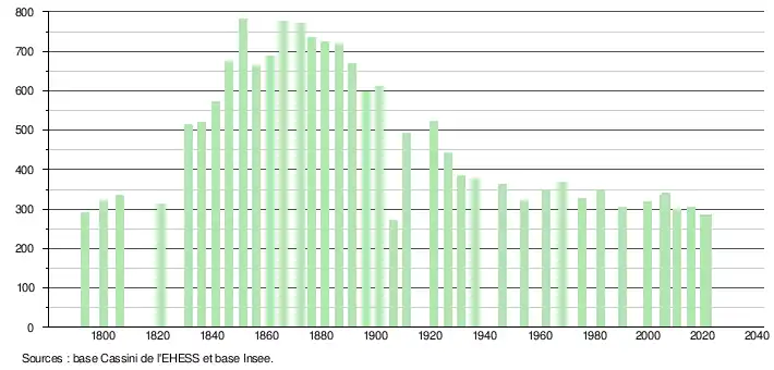 L'évolution du nombre d'habitants est connue à travers les recensements de la population effectués dans la commune depuis 1793. Pour les communes de moins de 10 000 habitants, une enquête de recensement portant sur toute la population est réalisée tous les cinq ans, les populations légales des années intermédiaires étant quant à elles estimées par interpolation ou extrapolation[23]. Pour la commune, le premier recensement exhaustif entrant dans le cadre du nouveau dispositif a été réalisé en 2005[24].