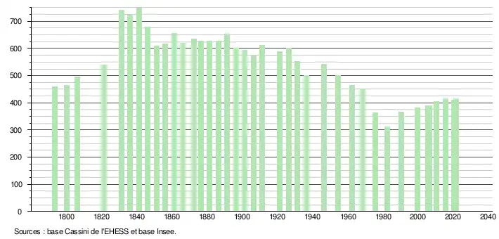 L'évolution du nombre d'habitants est connue à travers les recensements de la population effectués dans la commune depuis 1793. Pour les communes de moins de 10 000 habitants, une enquête de recensement portant sur toute la population est réalisée tous les cinq ans, les populations légales des années intermédiaires étant quant à elles estimées par interpolation ou extrapolation[22]. Pour la commune, le premier recensement exhaustif entrant dans le cadre du nouveau dispositif a été réalisé en 2005[23].