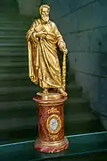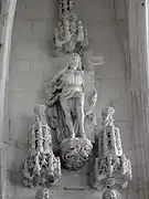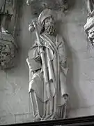 Deux statues majestueuses encadrent l’entrée principale sous la tribune d’orgue : saint Christophe traversant un torrent d’un côté et saint Jacques le Majeur de l’autre.