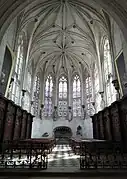 Cette partie de l’édifice date du XIIIe siècle. Le chœur a gardé 68 stalles du XVIIe siècle en chêne sculpté représentant Charlemagne et Angilbert relevant le monastère en ruine.