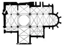 Les toitures de la nef, des croisillons du transept et du chœur, s’écartent de la tour-lanterne en formant des croupes afin de dégager les baies de la tour qui, habituellement, s’ouvrent au niveau d’un étage au-dessus des combles, mais qui n’a pas été élevé ici. La tour est surmontée d’un dôme à pans datant du XVIIe siècle surmonté d’un lanternon aveugle couronné par un bulbe.