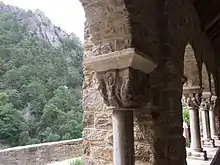 Les chapiteaux récupérés dans les villages voisins sont intégrés dans les constructions neuves face à la montagne. Ils sont de deux groupes différents par le style et l'époque.