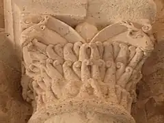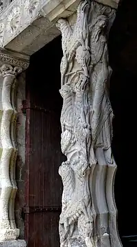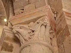 Le décor des volumineux chapiteaux, chefs-d'œuvre de composition, fait appel à des motifs végétaux ou animaux, tels ces loups et ces louves dont les têtes viennent se confondre, à l'angle, pour enlever un mouton, un oiseau ou un louveteau dans leur gueule. Ces animaux aux corps tendus, disposés en X sur la face principale, annoncent ceux du trumeau; ces images végétales et animales peuvent évoquer le jardin d'Éden[32].