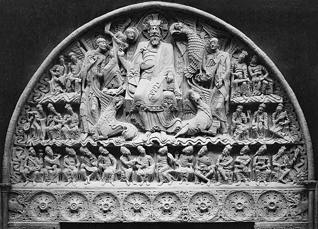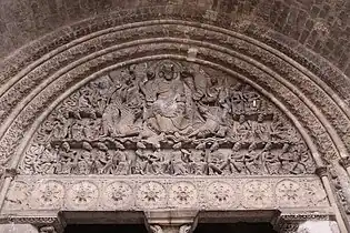 Réalisé entre 1110 et 1130, il s’inspire de l'Apocalypse de Jean et présente en son centre un Christ en majesté, les pieds reposant sur des nuages ou une mer de cristal (une légende populaire nommait cette dernière Reclovis en hommage à la création supposée par le roi Clovis)[25]. Cette figure, couramment utilisée pour le décor des tympans romans, est assise sur un trône en mandorle au champ semé d'étoiles aux rais perçants, évoquant l'arc en ciel de la vision.
