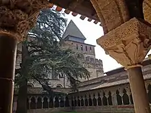 À l'angle Sud-ouest, un escalier conduit à la salle haute, puis au toit d'où l'on découvre une jolie vue, aussi bien sur la ville et, au-delà sur la vallée du Tarn et les coteaux du Moissagais, que sur le cloître lui-même.