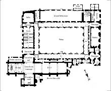 Orientée irrégulièrement avec une nette déviation de l'axe de l'édifice vers le sud-est du côté du chevet, l'église suit un plan cruciforme, et se compose d'une nef de quatre travées, anciennement accompagnée d'un unique bas-côté du côté nord ; d'un transept nettement débordant ; et d'un chœur de deux travées, qui se termine par un chevet plat. La longueur totale dans-œuvre est de 47 m, dont 27 m pour la nef, 7,50 m pour la croisée du transept et 12,50 m pour le chœur. Le croisillon nord du transept a 9,40 m de profondeur, dans un sens nord-sud ; le croisillon sud est moins profond. La largeur est de 8,4 m au début de la nef, et de 7,8 m à partir de la dernière travée de la nef jusqu'au chevet. La nef et le transept sont voûtés d'arêtes, et le chœur est voûté d'ogives. La hauteur sous les voûtes est de 14,1 m dans le vaisseau central, sauf dans la dernière travée du chœur, où elle est de 11,60 m. L'on entre dans l'église par le portail occidental de la nef, ou par le portail occidental du croisillon nord, accessible depuis le cloître. Celui-ci flanque la nef au sud, et le croisillon nord à l'ouest. Le croisillon nord est englobé dans les bâtiments conventuels, et deux pièces attenantes abritent la sacristie[24].