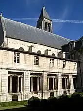 Le bâtiment conventuel néo-classique date des années 1660-1689, et se compose de deux massives ailes à l'est et à l'ouest ; d'une étroite aile septentrionale adossée à l'église ; ainsi que d'une aile méridionale qui ne comporte qu'un unique et haut étage, recouvert d'un toit faiblement incliné. L'ensemble du bâtiment est construit sur un sous-sol cryptique, qui communique avec une poterne passant sous le rempart Bellevue, aujourd'hui bouchée. Les ailes est et ouest ont une allure particulièrement impressionnante avec leurs deux étages, leur toit mansardé, et la façade représentative côté nord. Celle-ci compte six travées, est en effet plus large que le corps de l'aile occidentale qu'elle termine. L'entrée se situe au milieu de cette façade, entre deux statues modernes représentant Anne de Kiev et Dom Le Clerc, un peu en retrait sous un vestibule ouvert. Il s'ouvre par un péristyle à quatre colonnes, dont celles situées aux extrémités sont directement flanquées de colonnes corinthiennes, qui montent jusqu'en haut du premier étage. Elles encadrent une sorte de fronton simulé, qui repose sur un entablement supporté par les colonnes doriques. Le fronton est ajouré d'une fenêtre cantonnée de deux ailerons en bas-relief, et s'inscrit sous un arc en plein cintre, qui laisse libre deux écoinçons, en haut à gauche et à droite. Ils arborent des rinceaux végétaux en bas-relief. Au niveau du second étage, il n'y a plus de colonnettes, mais seulement des pilastres simples. Les deux baies centrales du second étage flanquent une niche abritant une Vierge à l'Enfant. Au niveau du troisième étage, les pilastres portent des plastrons formés par des feuilles d'acanthe. Avec les deux travées voisines, les deux travées centrales supportent un grand fronton en arc de cercle, qui termine la façade. Sa partie centrale a perdu son ornementation, mais à gauche et à droite, des panneaux sont sculptés de motifs végétaux en bas-relief. Les deux travées aux extrémités gauche et droite de la façade constituent des avant-corps légèrement saillants.