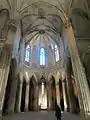 L'église est composée d'une nef de sept travées, (vaisseau central et deux collatéraux), débouchant sur un transept peu saillant qui s'ouvre sur neuf chapelles (dont sept rayonnantes ). Le déambulatoire du choeur donne une forte impression de profondeur grâce à quelques artifices architecturaux : piliers en amande, rétrécissement de l'espace entre les piles du chœur au fur et à mesure que l'on se rapproche du chevet et par conséquent arcs se brisant de plus en plus vers la partie centrale. Le transept s'ouvre, à droite, sur la "Porte des Matines" menant au dortoir des moines (et permettant l'accès direct des profès aux offices de nuit) et, à gauche, sur la "Porte des Morts" conduisant aux cimetière destiné aux moines et autres généreux donateurs.