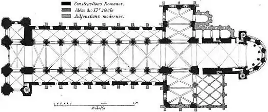 Les dimensions de l'église abbatiale de la Trinité sont plus modestes que celles de l'abbaye aux Hommes, l'abbatiale Saint-Étienne. L'emprise au sol de l'église abbatiale est de 1 594 m2 : 80 m de long, 19 m de large dans la nef, 32 m entre les deux bras du transept[9]. La nef de l'église de la Trinité est plus courte, moins large et plus basse que celle de son illustre compagne, mais elle est plus ornementée.