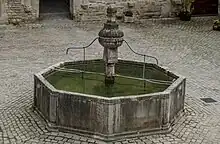 certains piliers et arcs de la galerie du cloître sont toujours visibles sur les façades de la cour. La fontaine du cloître du XVIe siècle, orne toujours le centre de la cour.