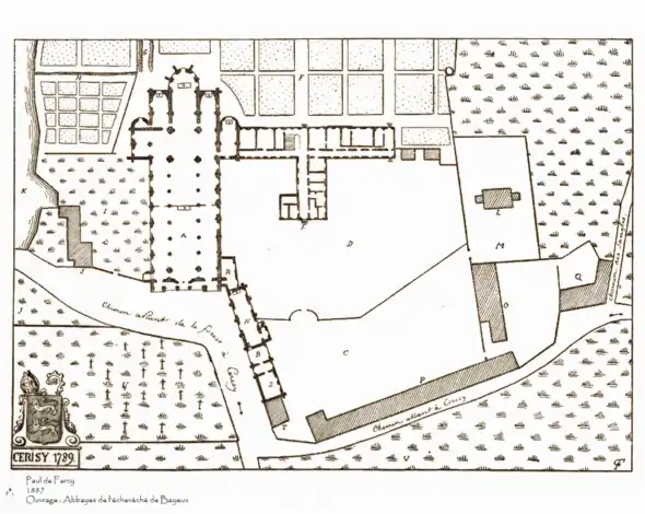 A. Église abbatiale ; B. Porterie : double porche voûté, dans un corps de bâtiment du XIIIe siècle ; C. Cour commune ; D. Cour des religieux ; J. Moulin à eau et ; K. Étang ; M. Cour de l'abbatiale ; N. Salle de justice et chapelle Saint-Gerbold. O, P, Q, T. Écuries, bâtiments annexes ; U. Cimetière.